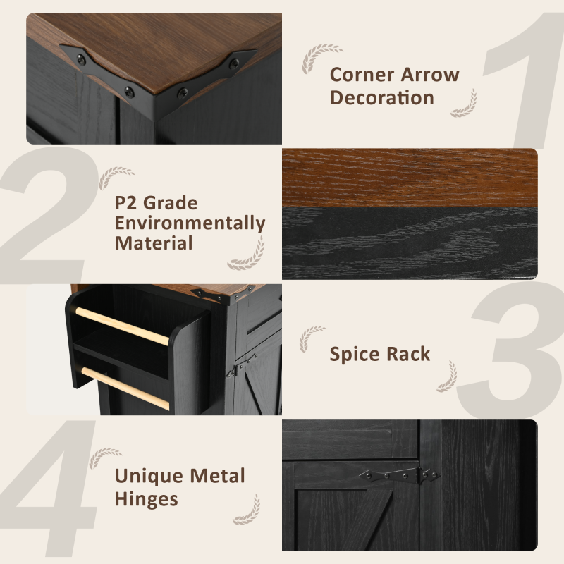| Summary | This 53.5'' W large rolling kitchen island brings farmhouse flair to your cooking space or eat-in kitchen.Crafted from a blend of P2 Grade engineered wood, it features a black base a light brown countertop, and farmhouse paneling for a classic, inviting look.With a drop leaf, power outlet, and locking wheels, this kitchen cabinet offers versatility and mobility.It includes two drawers, two cabinets with 2 interior shelves, and three doors, providing ample storage for your kitchen essentials. |