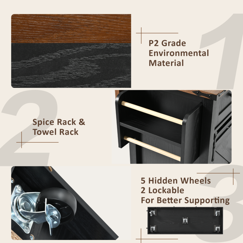 | Highlights | [Large Kitchen island with 47”W Table][Drop Leaf] [2Slide Barn Doors + 3 Deep Drawers][Ample Storage Space] [Power Outlet][5 * 360°Smooth Rotation Wheels ][Metal Hinges] [Metal Handle & Towel Rack][Spice Rack][Adjustable Shelf] [Eco-friendly manufactured P2 Board][Metal Corner Decoration] |