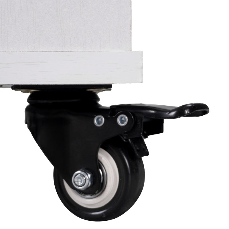 This mobile kitchen island on wheels is equipped with 5 universal wheels, 4 of which are lockable.Additionally, we offer six stationary cabinet feet as an alternative option if you prefer a stationary cabinet setup.